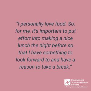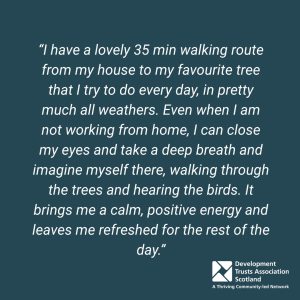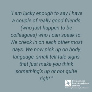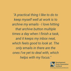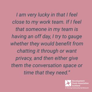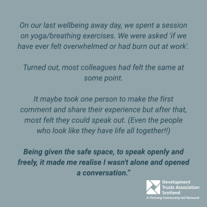 Facilitated by our Wellbeing & Inclusion Coordinator, Amy, the service provides tailored support to DTAS members and is available to development trusts that would like to focus on promoting the positive wellbeing of their staff team.